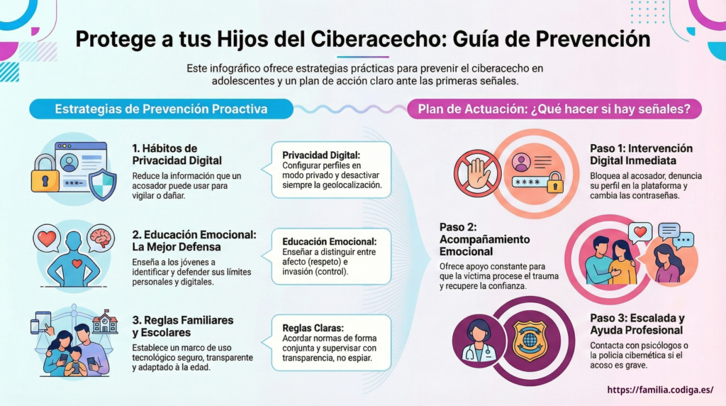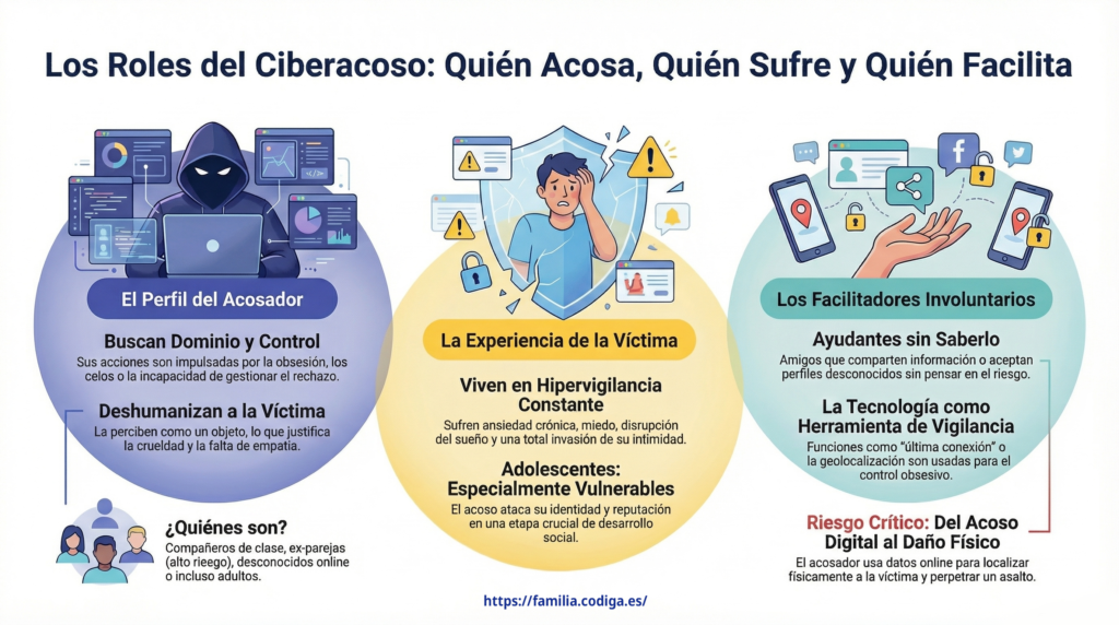 - Falta de Límites Digitales Claros: El desconocimiento sobre la configuración de privacidad lleva a compartir datos que pueden convertirse en «munición» para el acosador.