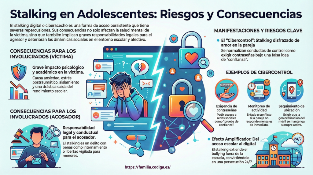 Una de las manifestaciones más perjudiciales del stalking es el cibercontrol dentro de las relaciones de pareja. La cultura juvenil a menudo normaliza la idea de que los celos y el control son signos de amor, llevando a los jóvenes a justificar como «pruebas de confianza» comportamientos que en realidad son abusivos y limitan su libertad.