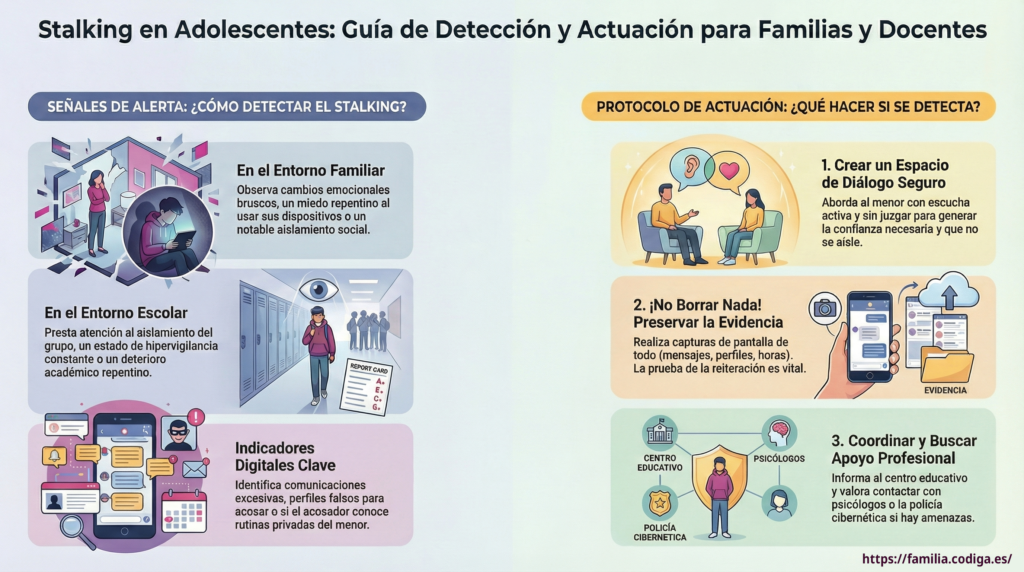Una amenaza esencial que deben conocer familias y educadores es que el stalking digital puede convertirse en un riesgo físico. El acosador puede utilizar los datos de ubicación recopilados en línea (por ejemplo, mediante GPS o metadatos) para obtener la ubicación física de la víctima y perpetrar un daño físico.